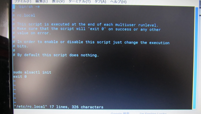 4. viが起動するので、空いている行にsudo alsactl init を入力。